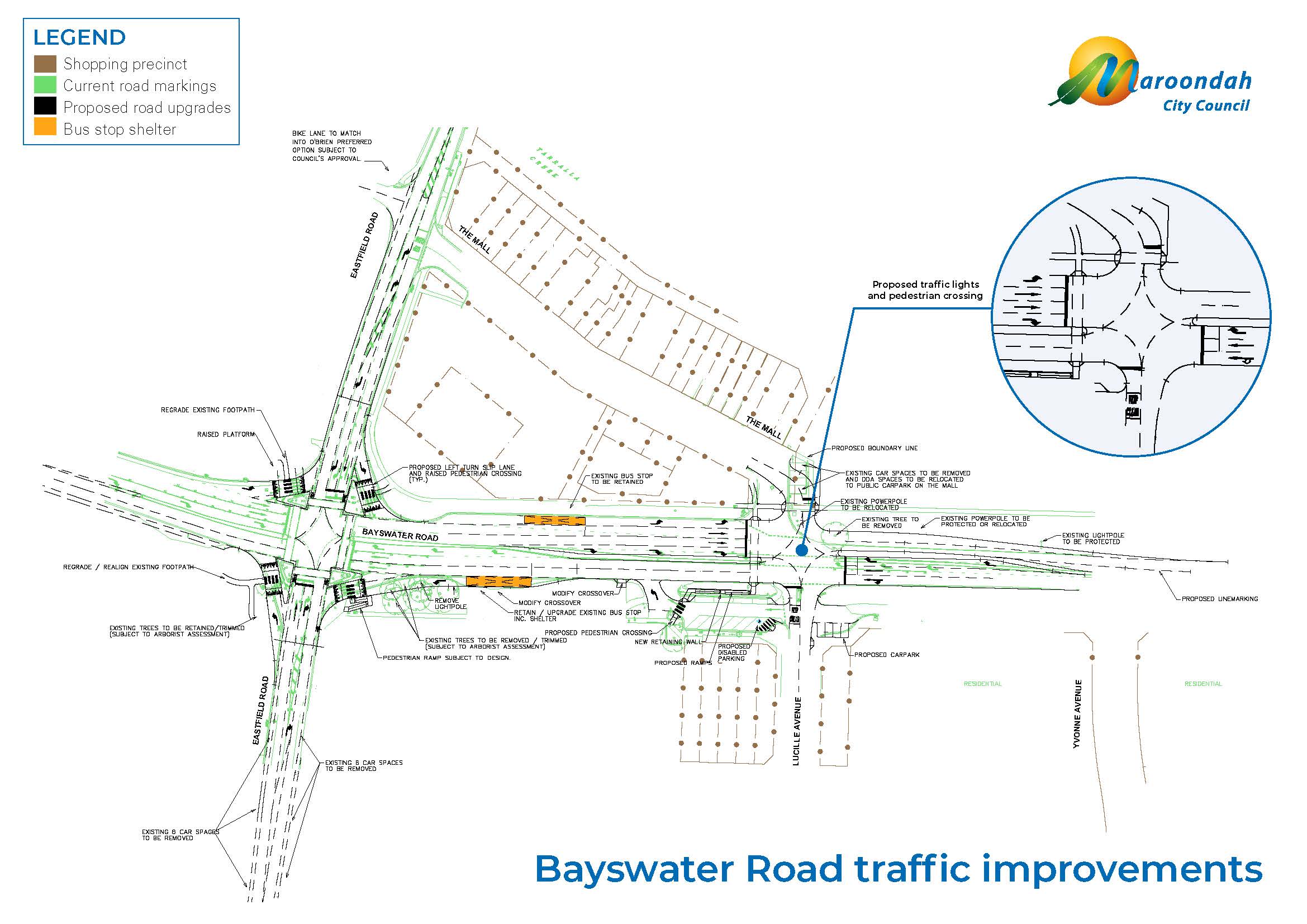 The infrastructure upgrades are proposed near The Mall Shopping Centre at the Eastfield and Bayswater Road intersection and across Bayswater Road to Lucille Avenue. Currently the Lucille Avenue shopping strip and The Mall shops (on opposite sides of Bayswater Road) are not well connected.