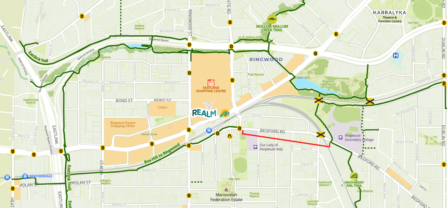 This project forms part of the larger Ringwood to Croydon Connect project, connecting Ringwood Station to Croydon Station by bike. This project will also create a vital link between the Box Hill to Ringwood bike path and the Heathmont Rail Trail (see below).