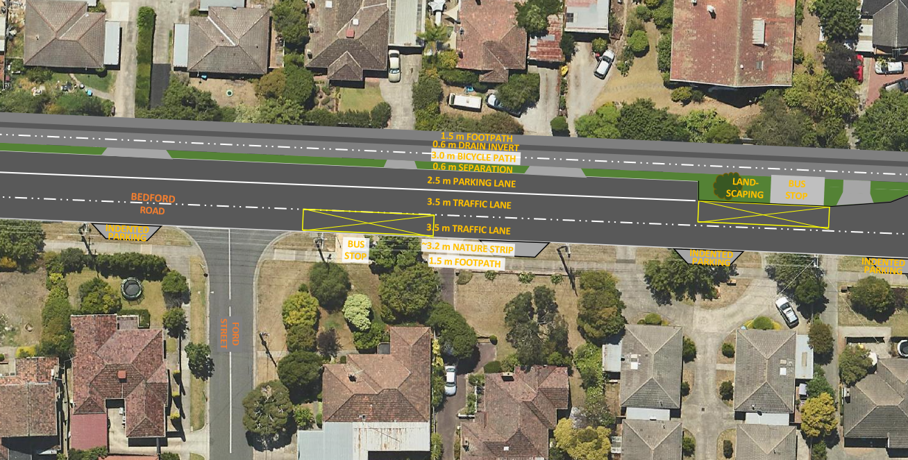- High quality off-road bicycle path to enable bike riders of various abilities to safely travel along the north side of Bedford Road.
