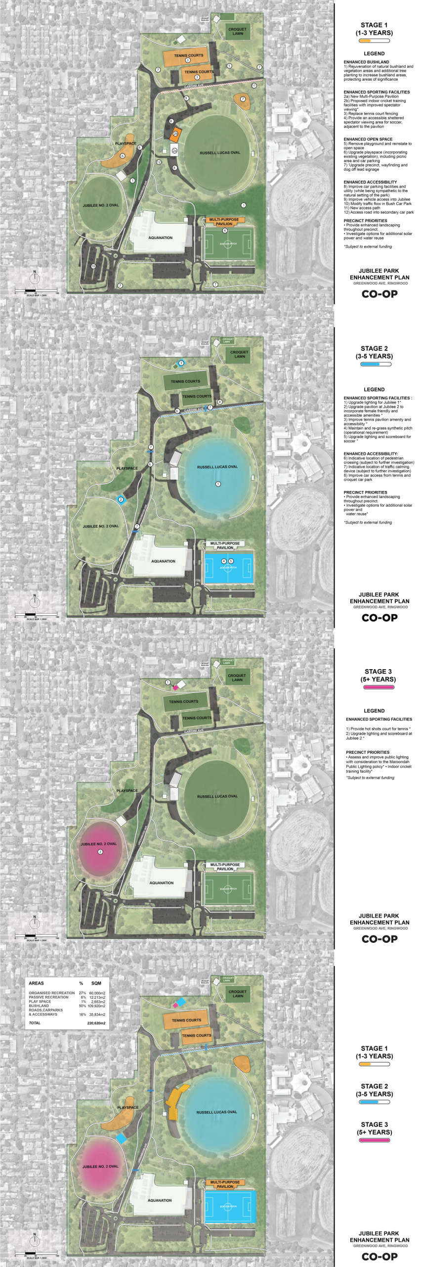 In consultation with key user groups and the broader community on a range of enhancements to Jubilee Park, the final Jubilee Park Enhancement Plan was endorsed by Council on 27 July 2020. As part of the endorsed Enhancement Plan works are set to commence on the following stage one components: